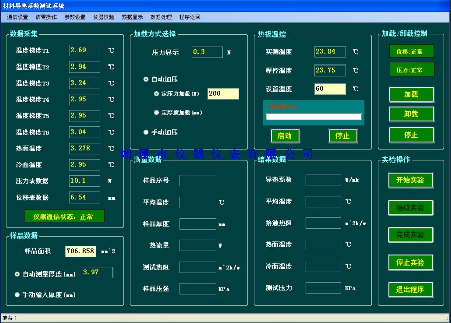 儀器特點(diǎn):帶自動加壓(配用減速電機(jī)、高精度壓力傳感器、調(diào)速器),自動測厚裝置(配用高精度位移傳感器測量),并連計(jì)算機(jī)實(shí)現(xiàn)全自動控制。儀器采用6點(diǎn)溫度梯度檢測,提高了測試精度。可檢測不同壓力下熱阻曲線,采用優(yōu)化的數(shù)學(xué)模型,可測量材料導(dǎo)熱系數(shù)熱阻以及界面處接觸熱阻等多個參數(shù)。